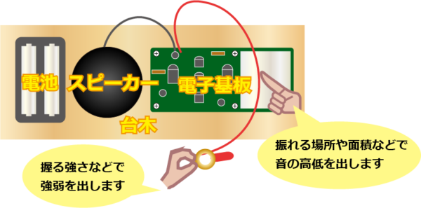 完成した“不思議な電子楽器”の音階は金属部分の触れた位置によって変わります。場所を変えて音の変化を確認する子もいました。専門的に言えば抵抗値の変化によって音の変化を出す、という電子楽器の仕組みを実体験して楽しみながら習得する、こんなことが教えてもらえば小学生でも理解できるのです。
